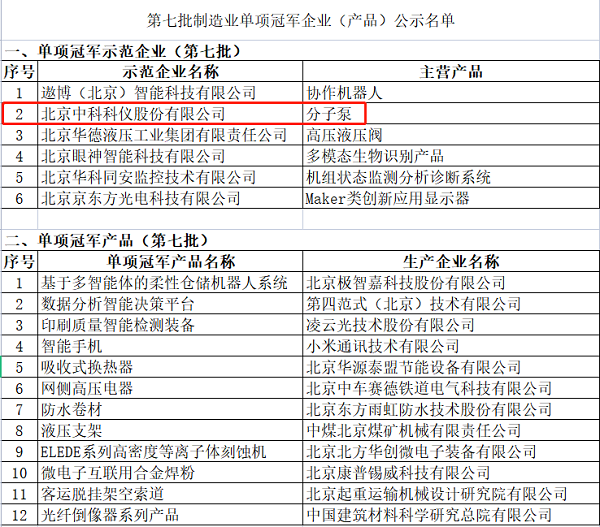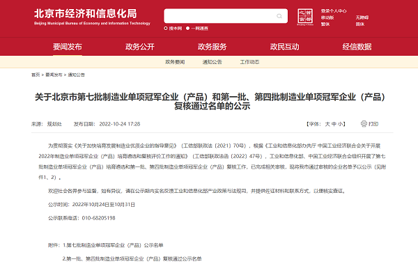 2022年10月24日,北京市經(jīng)信局公示第七批國家級制造業(yè)單項冠軍企業(yè)(產(chǎn)品)名單,該名單由工業(yè)和信息化部、中國工業(yè)經(jīng)濟(jì)聯(lián)合會審核通過,北京中科科儀股份公司再獲制造業(yè)單項冠軍示范企業(yè)殊榮。